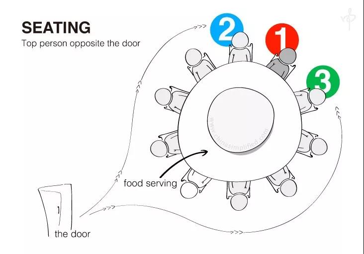 The guest of honor will usually sit facing the entrance, followed by the second most important person. If the guest of honor is not seated, other are not permitted to sit there. This may seem quite different from what you experience back home.
